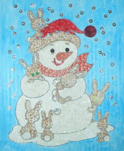 Весёлый снеговик Конкурсная поделка «Веселый снеговик» Поделку подготовила Широглазова Виктория, 9 лет. Руководитель: Городецких Наталья Федоровна, МБОУ ДОД "Центр дополнительного образования детей", педагог дополнительного образования. Красноярский край, город Ачинск Мозаика из яичной скорлупы на Новогоднюю тему. Описание работы Для работы понадобится: плотная бумага или то, что собираетесь украшать, карандаш, кисточка, пинцет, клей ПВА, краска (любая быстросохнущая), яичная скорлупа. С скорлупы надо удалить внутреннюю пленочку. Можно использовать белую, можно любых цветов, например, с пасхальных яиц. Главное - не берите кусочки с напечатанным на яйце штампом. 1. Рисуем на объекте украшательства (в данном случае - бумага) любую желаемую форму или картинку – сюжет как в нашем случае. 2. Закрашиваем клеем ПВА часть н-р. пока елочку. Пока небольшую. Берем кусочек скорлупы и прижимаем её к клею, по ходу раздавливая. Намазываем клеем следующий кусочек, прижимаем скорлупу, и заполняем всю форму. На пробелы между скорлупками пока можно не обращать внимания, заполняем довольно приблизительно. 3. Теперь идут в дело мелкие осколки скорлупы, оставшиеся от работы. Мажем пустые участки клеем, и подбираем под них кусочки, помогая себе пинцетом. 4. Таким образом, делаем всю картинку. Крохотные участки заполнять необязательно, но если вам это понадобится, то можно сделать кашицу из ПВА и мелкой скорлупки, и замазать ею трещинки. 5. Картинку можно раскрасить краской. Мы используем акрил, можно и акварель, и гуашь. Стараемся прокрасить трещинки. 6. Оставляем сохнуть. Поделку можно украсить различными стразами, блестками, звездочками, кому как нравиться. 7. Можно украсить рамочкой. | |
